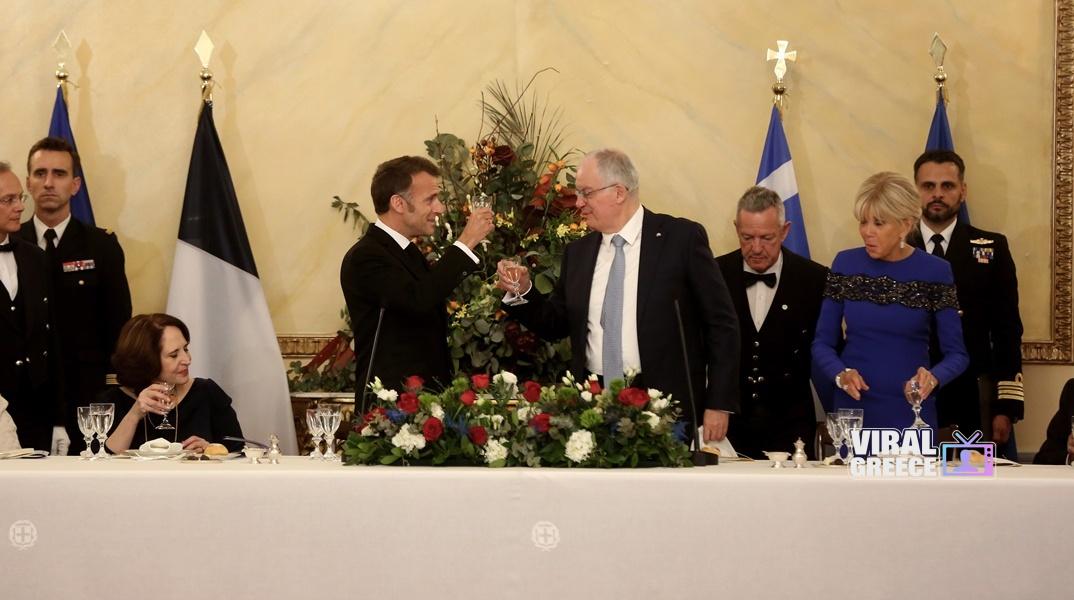 Το επίσημο δείπνο, που πραγματοποιήθηκε στις 24 Απριλίου 2026, συγκέντρωσε πολιτικούς, επιχειρηματίες και προσωπικότητες του πολιτισμού. Παρόντες ήταν ο πρωθυπουργός και υψηλόβαθμα στελέχη, με ευδιάκριτη τη διπλωματική χροιά της συνάντησης.Η ατμόσφαιρα στο Προεδρικό ήταν επίσημη αλλά θερμή, με ελληνικές και γαλλικές σημαιες να δίνουν το τόνο.